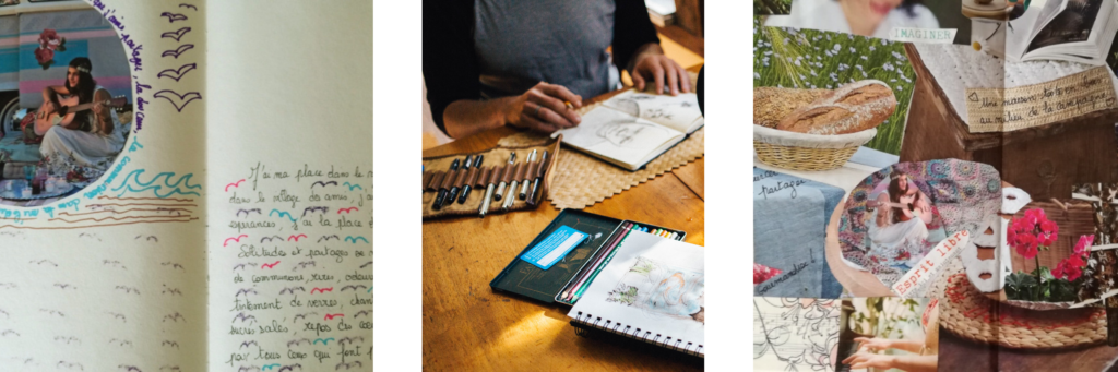 C’est un journal d’exploration de soi qui allie l’écriture, le dessin et le collage de façon créative. C’est un des nombreux média de l’Art-thérapie. Il est ludique et accessible à tous.